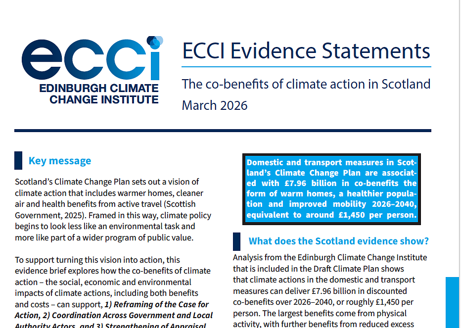 To support turning this vision into action, our first ECCI evidence brief highlights how co-benefits – the social, economic and environmental impacts of climate actions – can support and strengthen collaborative climate action and contribute to delivering the Plan - a timely message for the next Government and Parliament who will soon seek to steer Scotland towards a sustainable, resilient and fairer future for us all.